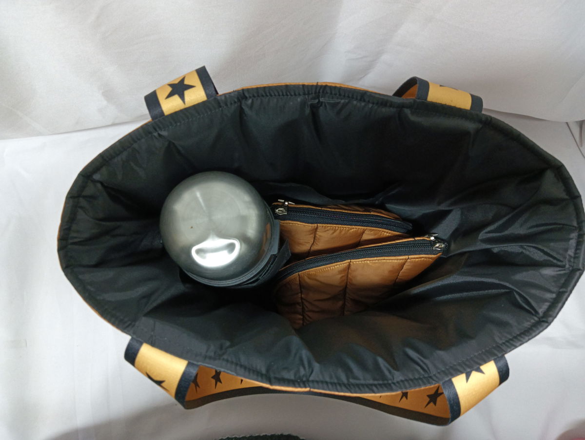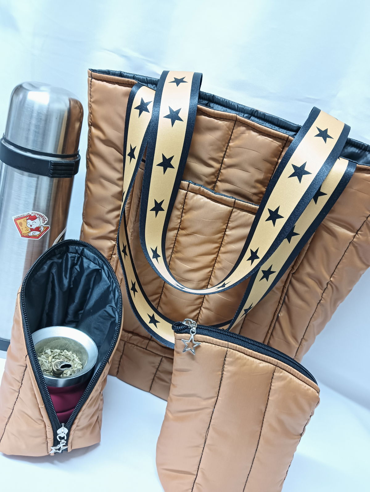 Bolso Matero en tela puffer con bolsillo exterior forrado en silver impermeable con bolsillo y sujeta termo.