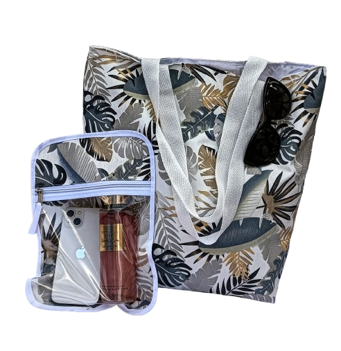 Bolso de lona estampada forrados en tela silver impermeable con bolsillo interior más neceser transparente con cierre y cristal.